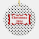 Una pareja expectante de una figura de palo, un niño súper héroe y un gato frente al árbol de vacaciones decorado con un área que dice "¡Estamos esperando!". El adorno de atrás es blanco con puntos de polka negros, un cartel blanco de borde rojo y texto rojo que dice Navidades 2014.