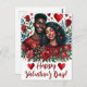 Esta postal presenta una feliz pareja negra rodeada de corazones rojos y enmarcada por rosas rojas. El texto dice "Feliz Día de San Valentín" pero es personalizable. Las acuarelas rompen con amor y afecto en un esquema de color rojo y blanco.