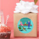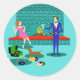 Esta pareja retro con Pegatinas de perro parece una escena de una comedia romántica. El estilo de los años 60, con un diseño de arte minimalista, cuenta con una atractiva pareja que disfruta de una velada romántica en casa. La sofisticada sala cuenta con una chimenea de agua y ladrillo verde azulado con una cornisa de color rojo intenso. Una hermosa mujer pelirroja con un vestido brillante y rosa está encaramada en la cornisa. Está disfrutando de un martini con una aceituna flotante, un fuego ruidoso, buena música y la compañía un hombre alto, oscuro y guapo. El hombre lleva puesto un traje azul y corbata roja. Su vaso martini se cría para brindar por su encantador compañero. Por otro lado, está sosteniendo un álbum de discos de vinilo. A sus pies, vemos a un adachshund más adorable usando un collar rojo. El juguetón perro encerador está caminando en dirección a un jugador de récords verde con patas naranjas y de húsculo. En el suelo hay un colorido grupo de discos de vinilo divertidos, eclécticos. Salud! Aquí está la velada perfecta en casa.