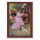 Un par se asienta al aire libre antes de una tabla de mimbre debajo de las linternas de papel. La señora, que está llevando un vestido rosado y tiene su pelo para arriba, está vertiendo el té para el caballero que ha escondido su gorra de paja y bastón debajo de la tabla. Hay un pequeño taburete plegable con el libro y el paraguas de la mujer proped contra él. Un ilustracion del vintage de una revista 1908.