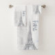 El diseño cuenta con la Torre Eiffel y con flores azules.