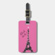 Una etiqueta rosada brillante del equipaje acentuada con la torre Eiffel, encendida para arriba en la noche.