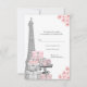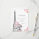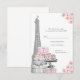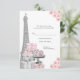Tarjeta de respuesta París RVSP con una hermosa Torre Eiffel plateada, elegantes paquetes de regalo de París, zapatos de tacón alto plateados con brillo sobre un fondo floral rosa. Esta hermosa tarjeta de rsvp de París se personaliza fácilmente para tu evento simplemente agregando tus detalles en el estilo de fuente y color, y redacción de tu elección. También puedes cambiar el color del fondo. Este es un diseño impreso sin diamantes reales, joyas, brillo, etc.