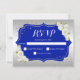 Partido de Cumpleaños RSVP - Tarjeta Blanca de Plata azul real. Presenta un elegante tipo de letra de guión, rosas blancas y confeti. Diseño elegante con una falsa plata purpurina. Perfecto para una celebración de glam.