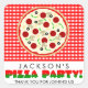 ¡Nuestro Partido Pizza favorece a los pegatinas y hará que todos tengan hambre de pizza! El diseño incluye las palabras "¡Fiesta Pizza!" en rojo y verde junto a un mantel de cuadros rojos y blancos y una gran pizza suprema.