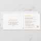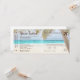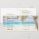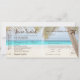 Una plantilla de invitación de boda con boleto de avión y pase de abordar sobre una foto de fondo de una palmera y una playa de arena con una tarjeta de RSVP incorporada que los invitados pueden cortar y enviar por correo con su respuesta. Hay espacio en el reverso para información opcional de agente de viajes y alojamiento de hotel, y el sitio web de la boda, de modo que toda la información que los invitados necesitan esté junta en una invitación de boda de destino de playa simple pero única.