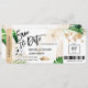 Destino Boda de Playa Pase de Abordar Ticket de Oro Avión Tarjeta de Guardar la Fecha con icono de Crucero con hojas tropicales