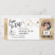 Pase de Abordar Ticket de Boda de Destino en la Playa con Avión Dorado Guardar la Fecha con corazón y icono de avión con mapa mundial de arte de línea minimalista simple