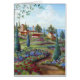Escena italiana, porciones de azul, verdes, flores, pueblo en distancia.