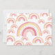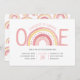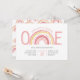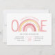 Pastel chica Arcoiris invitaba por primera vez a una niña que se volvía una. El diseño está decorado con un dibujo de arco iris en tonos rosas y amarillos. El arco iris ayuda a formar la palabra "ONE" y la redacción de la invitación está escrita en tipografía caprichosa. Agradable y de moda arcoiris boho 1er cumpleaños con un patrón de arcoiris en la parte trasera.