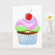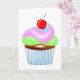 Un diseño delicioso de un quequito con cereza encima. Este diseño de quequitos parece delicioso. El bizcocho es de color verde y rosa y luego una cereza sentada encima. Este bizcocho con cerezo en el diseño superior se ve genial en estas tarjetas de felicitación