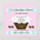 Esta gran fiesta de cumpleaños número 65 ofrece un bizcocho con un fondo rosa con acentos acuáticos y blancos. Todos tus detalles importantes de la invitación están dentro del quequito haciendo una divertida invitación para una fiesta de cumpleaños número 65. Copyright henishouseofpaper