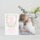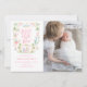 This birth announcement features a nativity image of baby Jesus sleeping in a manger with Mary and Joseph in the center surrounded by a the wise men and two angels. The top has a greeting that says "For unto us a child is born." This would make a great Christmas card to announce the arrival of a new baby.