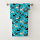 Perros escoceses, negros, grises y triturados con arcos, con huellas de toros y huesos de perro sobre un fondo azul.