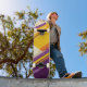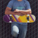 Skateboard mostrado en una imagen gráfica abstracta de varios colores morado y dorado. Colores Purple, Gold, White Multi Buy tal y como está o personalizar este artículo a tu gusto. Imagen de stock