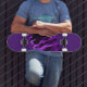 Skateboard mostrado en una huella gráfica de humo abstracta de varios colores púrpura. Colors Purple Multi Buy tal como es o personalizar este artículo a tu gusto. Imagen de stock