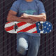 Skateboard mostrado en una huella gráfica patriótica de la bandera de Estados Unidos. Compra tal cual o personalizar este artículo a tu gusto. Imagen de stock