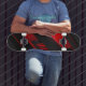Skateboard mostrado en una impresión gráfica abstracta de color negro y rojo. Colores Negro, Rojo, Carbón Compra tal como está o personalizar este artículo a tu gusto. Imagen de stock