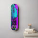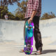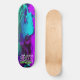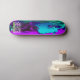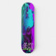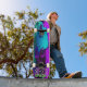 "ARKN: softcorp" : Echado en verde azulado eléctrico, el críptico texto en la base de la junta llama a almas curiosas. ¿Es una corporación? ¿Una orden clandestina? O tal vez ambas cosas: un colectivo clandestino que trata de sueños y metamorfosis. Las cartas se giran, con los ojos en el espejo, un acertijo para los que se atreven a andar. Ruedas de mañana: Las ruedas —llenas de neón, susurro-silenciosas— giran como los engranajes olvidados del tiempo. Llevan el peso de innumerables viajes: desde callejones hasta santuarios en la azotea, desde la realidad hasta reinos aumentados. Cada revolución promete una transformación: una oportunidad para liberarse o ser consumida. El Velo Violeta: La cubierta del patinador, un lienzo de púrpura de medianoche, captura la esencia de mil sueños virtuales. Se resplandece con irritcencia, como si estuviera tejida a partir del polvo de estrellas y el código deslucido. El propio color susurra de recuerdos olvidados y realidades fracturadas. En su corazón, emerge un personaje de anime —una fusión de humano y máquina. Su cabello esmeralda desafía a la gravedad, un cometa verde que se extiende a través del tablero. Los ojos, luminosos y enigmáticos, guardan secretos que podrían reescribir destinos. Sus miembros cibernéticos llevan cicatrices de batallas peleadas en reinos más allá de la pantalla.