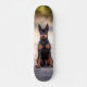 La patineta tiene un diseño específico, representando la figura de un Pinscher miniatura. En este diseño, el Pinscher miniatura está representado en una posición de vigilancia, sentado. Esto implica que la representación en la patineta muestra al Pinscher en una actitud atenta y observadora mientras se encuentra en una posición sentada. La combinación de la forma de la patineta con este diseño particular le confiere un estilo único y distintivo, fusionando la funcionalidad de la patineta con la estética de la figura de un Pinscher miniatura en actitud de guardia.