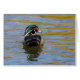 Una imagen distintiva de un pato de madera macho mientras flota sobre el agua rizada en la luz suave matutina.