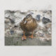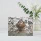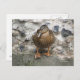 Esta postal muestra una fotografía de un hermoso pato marrón con un pico naranja brillante. El pato está parado en una pared que da a un lago y parece que está muy pensado.