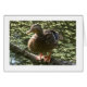 Una gallina mallarda de aspecto feliz se sienta en una rama tomada en el lago Roath Park, Cardiff.