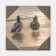 Una bonita fotografía de una pareja de patos mallard en una playa de arena mirando la puesta de sol.