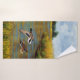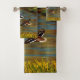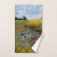 Patos machos y hembras de mallard huyendo sobre un estanque dorado, riego para reflejar los colores del fondo follaje otoñal brillando a la luz del sol. Obra de arte realista creada a partir de una pintura al óleo original de la artista de vida silvestre Crista S. Forest.