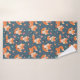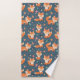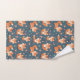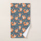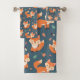 Toallas con un patrón hecho con zorros naranjas lindos y felices. Fondo verde oscuro. Se esparcieron pequeñas setas y hojas.