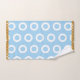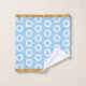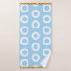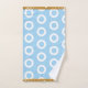 Un conjunto de toallas de baño geométricas y audaces que presentan un patrón moderno de círculos concéntricos en azul claro y blanco con un detalle distintivo de borde dorado. Este conjunto de toallas de baño con patrón de círculos concéntricos en azul claro, blanco y dorado está diseñado para baños contemporáneos, y aporta una declaración gráfica limpia a su espacio cotidiano sin comprometer el estilo. El contraste nítido de los círculos blancos sobre azul claro suave con un borde dorado cálido crea un ambiente moderno sofisticado. Un regalo elegante para estrenar casa o cumpleaños para los amantes del diseño contemporáneo.