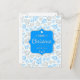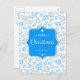 Ilustracion de árboles de Navidad en suaves colores azules y plateados. Un patrón de Navidades gentil y elegante con una insignia azul con el guión Feliz Navidad y Feliz Año Nuevo.