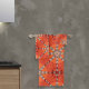 El diseño de toallas de baño modernas y vibrantes presenta un patrón impecable de formas geométricas en rojo, naranja, gris y blanco.