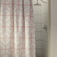 Una peculiar cortina de ducha con motivos estampados en la bandera del Reino Unido en delicados tonos rosas -milenarios- mi sombra favorita.