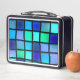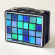 Esta caja de almuerzo tiene un patrón de caja azul.
