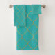 Toallas con patrón de cuatro hojas en azul verdoso y dorado.