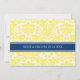Tarjetas de invitación de matrimonio en elegante y contemporáneo color amarillo limón brillante, azul marino oscuro, y blanco clásico y moda color damasco floral. Personalizar estas invitaciones con los detalles de su boda. Disponible en productos para todas las necesidades de su boda.