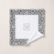 Patrón de damasco gris con bordes de vieiras blancos conjunto de toallas de baño. La toalla de baño presenta un diseño elegante de damasco gris y blanco y bandas blancas en los lados cortos con bordes de vieiras. También hay un cuadro con el nombre de tu familia. La toalla muestra un borde de vieiras alrededor, mientras que el paño blanco es blanco en el centro con un borde de damasco y un monograma. Puede personalizarlo con el nombre de su familia y el monograma.
