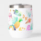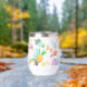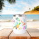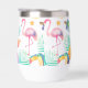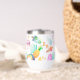 Aquí hay un divertido vino termal, agua o un vaso de café que puede llevarte de las tareas domésticas a la playa o a cualquier otro lugar con estilo. Presenta un patrón de imágenes tropicales que incluye limones y rodajas de pomelo, hojas de palma, helados helados helados, un pájaro toscano y, por supuesto, un flamingo rosa. El patrón se coloca sobre un fondo blanco, con su monograma de dos letras en dos lados.