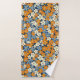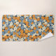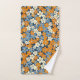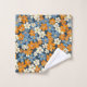 Un patrón floral vibrante cubre toda la imagen. Las flores, pequeñas y estilizadas, en tonos naranja, azul claro y blanco roto, están densamente dispuestas sobre un fondo azul marino. Las flores tienen un aspecto ligeramente imperfecto, de aspecto pintoresco, con variaciones en la saturación de color y en la forma que le dan al patrón un aspecto texturado, casi pintado a mano. El patrón repetido crea un efecto visual alegre y ocupado.