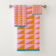 Un diseño gráfico divertido y colorido en negrita de patrones geométricos de triángulo en colores brillantes de azul turquesa, naranja y rosa.