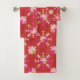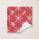 Un diseño divertido y moderno de bloques de tejido de motivos triangulares en oro milenario rosa y ámbar sobre un fondo rojo brillante.