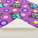 Una manta de sherpa de gran tamaño con un diseño de patrones adorable y colorido de gatos grises y verde azulados contra un fondo violeta morado con acentos de puntos polka multicolores.