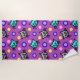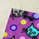 Una toalla de playa con un bonito diseño colorido de gatos grises y verde azulados sobre un fondo violeta violeta morado con acentos de puntos polka multicolores.