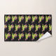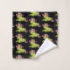 Toalla con una imagen repetitiva de un unicornio de estilo Frankenstein. Colores púrpura y verde. Qué lindo.