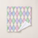 Una marca de verificación de diamantes en tonos pastel (rosa, azul, verde y violeta) se combina con el blanco antiguo en este juego de toallas de bonito.