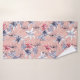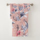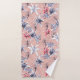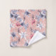 Patrón colorido de lirios rosas, blancos y azules sobre un fondo rosa claro.