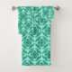 Toalla ambientada en un clásico kimono japonés de estilizado, de cuatro vías, medallones de hojas y flores en turquesa profundo sobre un suave fondo acuático