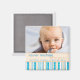 Muestra a tu nuevo chico con este divertido y juguetón imán de diseño de estribos azules y marrones. Se personaliza fácilmente con la foto de su bebé y detalles importantes y hace una invitación o regalo especial para un bebé.