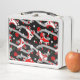Motocicleta roller Rockabilly derribar inspirado en el patrón de caja de almuerzo. Cerezas, rosas, patines y dados en una cinta gris y delicado fondo de polka punto.
